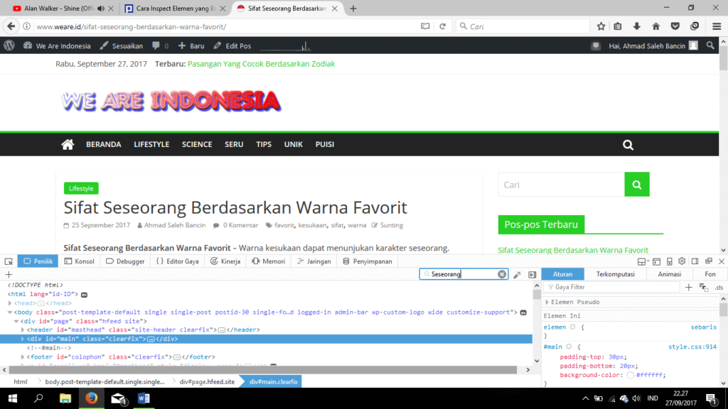 NB : Kalian bisa memilih elemen atau bagian lain yang ingin di ubah. Cara cepatnya adalah pada jendela inpect element, arahkan mous pada baris kode yang terlihat.
