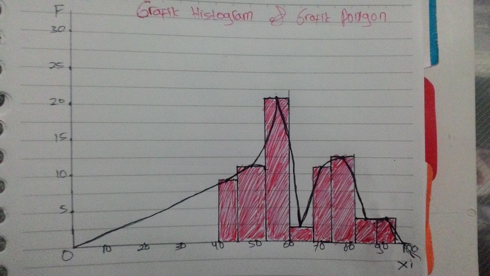 Keterangan: Gambar berbentuk grafik persegi panjang tersebut disebut grafik histogram dan gambar berbentuk garis yang menghubungkan titk tengah setiap grafik disebut grafik polygon.
