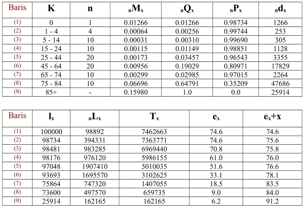 Menurut BPS, Life Table atau tabel kematian adalah suatu tabel yang memuat tentang data kematian menurut umur yang berguna untuk menghitung berbagai parameter demografi, seperti umur harapan hidup, angka kematian kasar, angka kelahiran kasar, dan probabilitas mencapai usia 40 tahun.